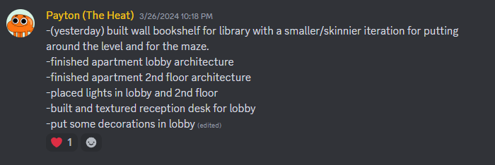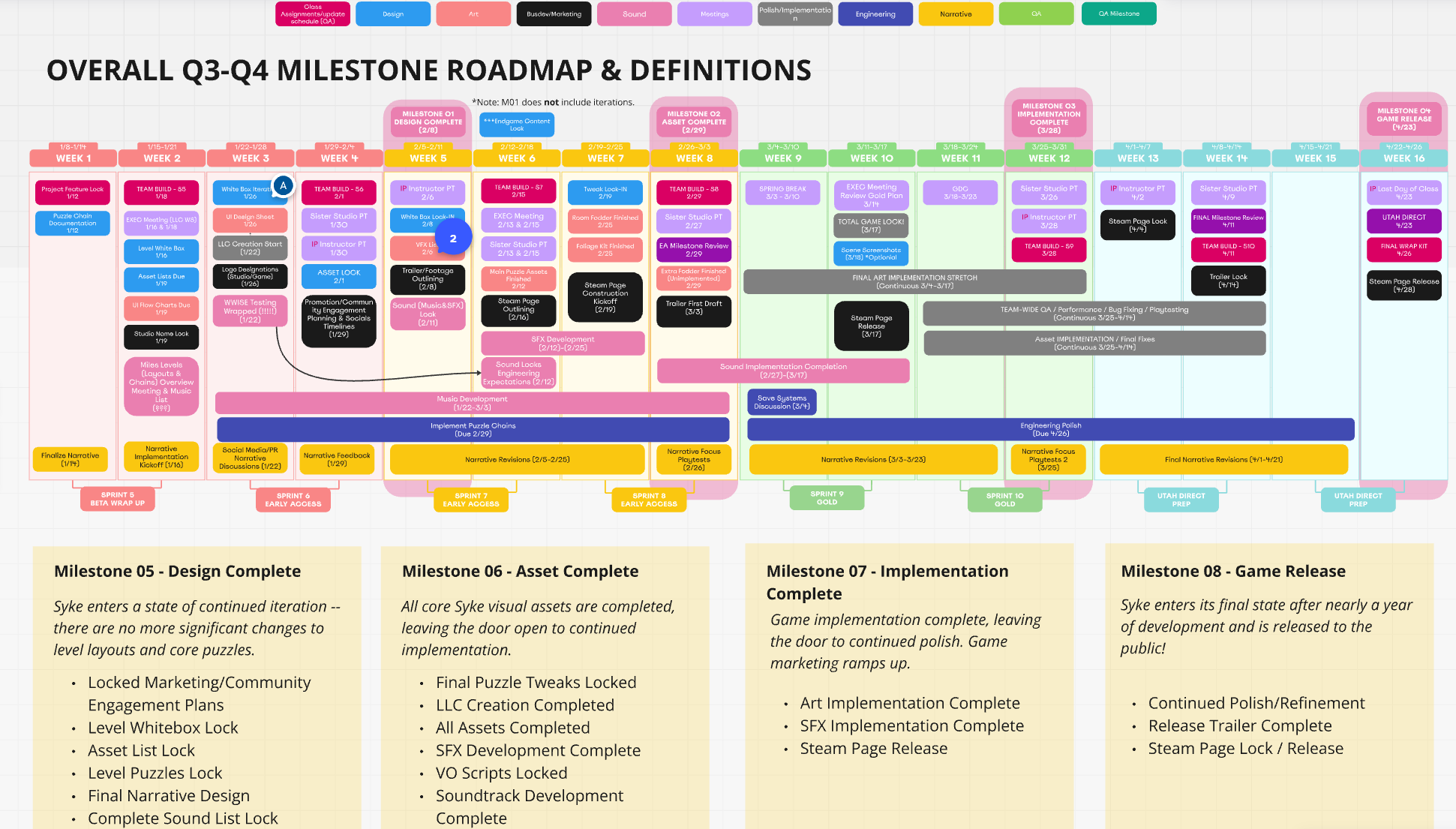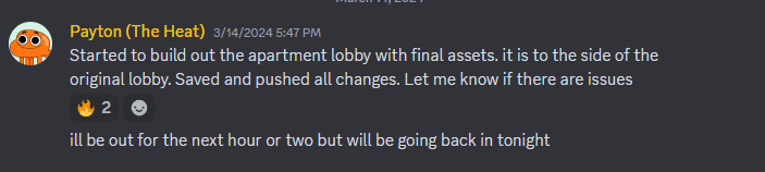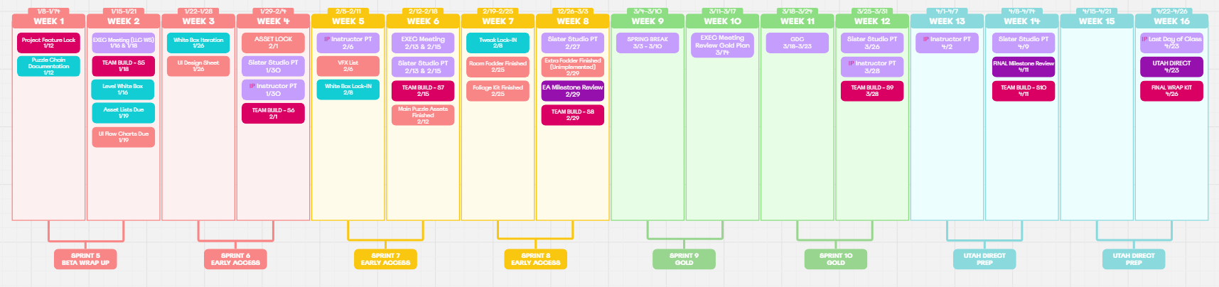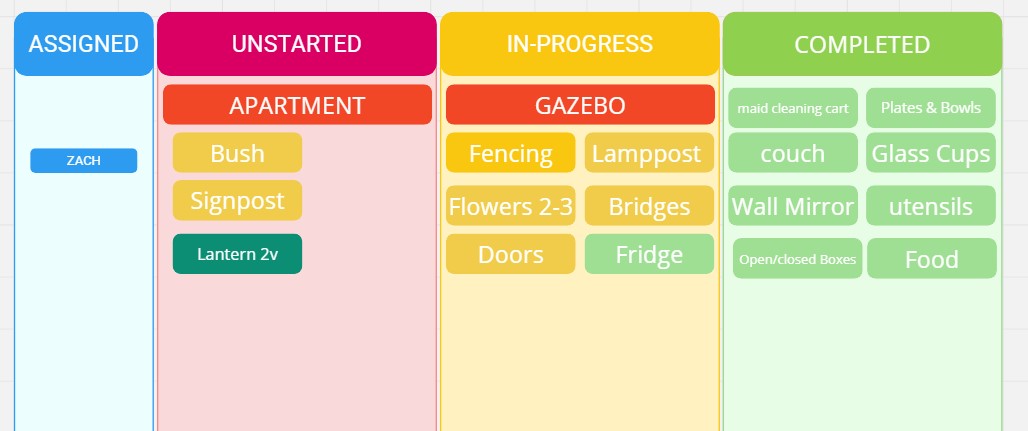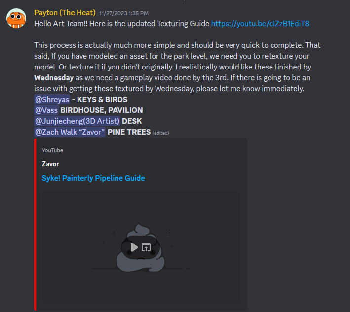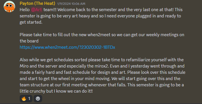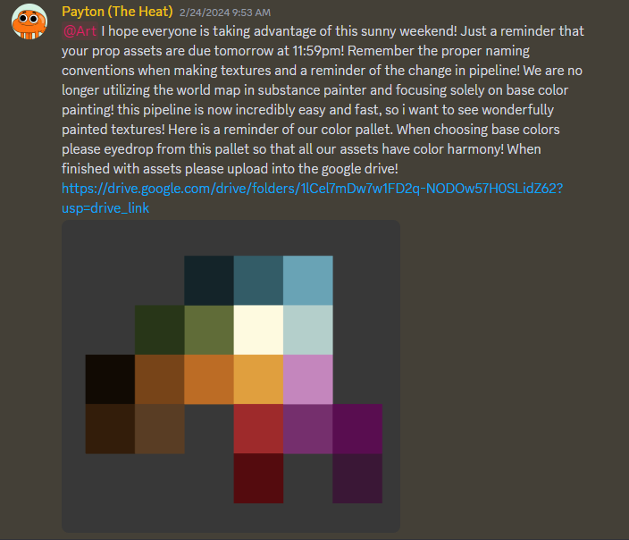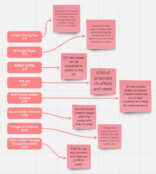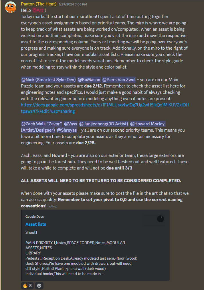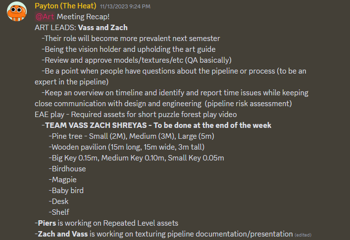 I set up a structure of weekly art meetings as well as in person 1-on-1 check ins where I could talk about the state of the project not only in terms of the art pipeline but also in how we fit in the development pipeline.